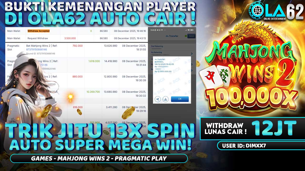 OLA62 kembali menampilkan bukti kemenangan player melalui permainan Mahjong Wins 2 dari Pragmatic Play. Seorang member berhasil melakukan WD sebesar Rp12.000.000 dengan proses pencairan yang cepat dan lunas. Riwayat transaksi tercatat jelas, menunjukkan sistem pembayaran OLA62 berjalan aman dan terpercaya.